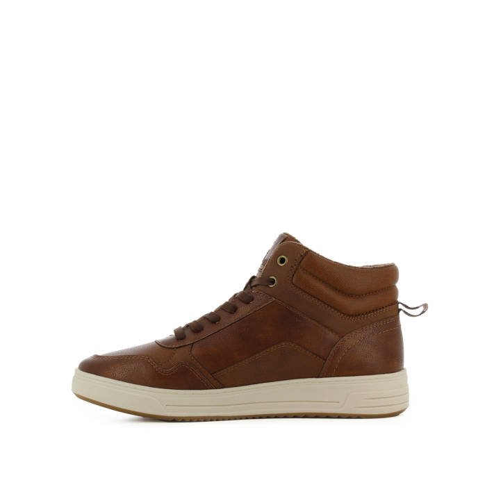 Men’s brown sneaker boot with a white sole and modern sporty design. It features lace-up fastening for a secure and adjustable fit, providing everyday comfort and casual versatility with extra ankle support.